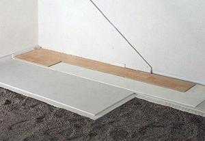 У подготовленных элементов пола, которые примыкают к стенам, фальцы на участках сопряжения обрезают. Новые ряды начинают с укладки отрезаемой части от крайнего элемента предыдущего ряда, чем исключаются отходы и обеспечивается смещение торцевых стыков не меньше чем на 25 см. Пазы плит, выравниваемых в горизонтальной плоскости, промазываются обычным ПВА или полимерными клеями. Укладываемые на клей ГВЛ закрепляются при помощи саморезов (по технологии Тиги Кнауф).