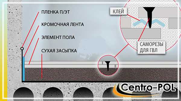 Схема устройства сухого пола и крепления плит ГВЛНедостатки: