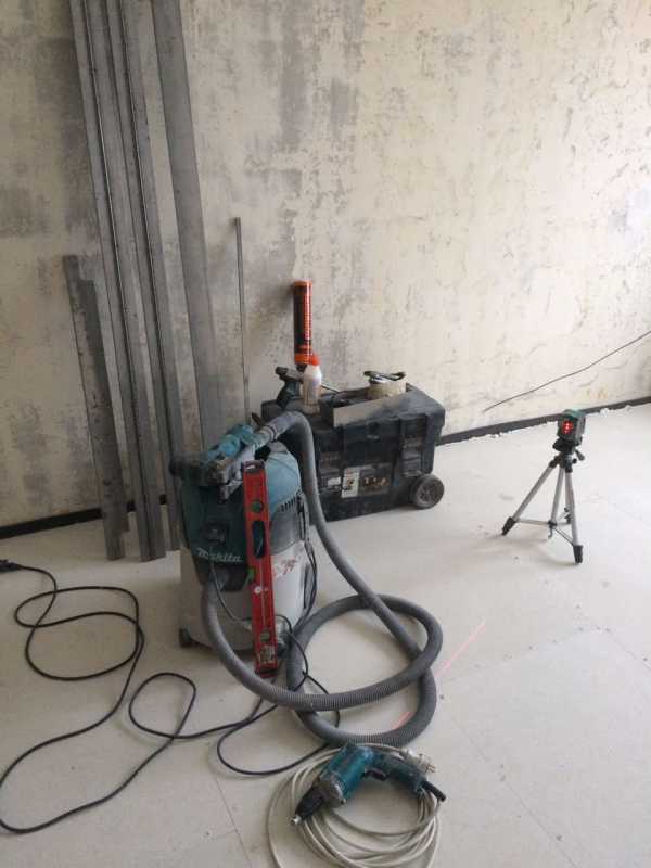 Затем определяется толщина ГВЛ-плиты, и на стене делаются соответствующие отметки для выхода на уровень керамзитовой засыпки. После выполнения разметки заделываются все глубокие неровности и трещины, используя для этого специальные сухие смеси от фирмы Кнауф.