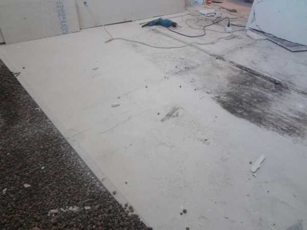 Важно! До того как приступит к укладке пароизоляционной пленки, необходимо сначала обработать основание пола. Для этого мы заделываем все дыры и щели в нем посредством алебастра, который, как известно, достаточно быстро застывает. Если по периметру будут проходить провода, то их тоже нужно завернуть в гофру и максимально прижать к основанию. Напомним, что слой керамзита должен составлять минимум два сантиметра, помните об этом.