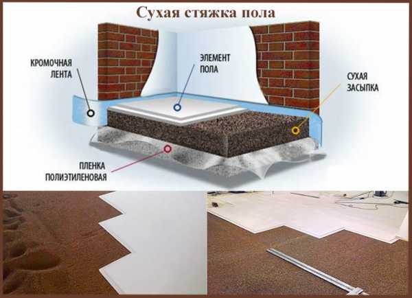 Схема устройства “сухого пола”Большой интерес в это же время вызывают технологии строительства сухой стяжки, которую можно изготавливать своими руками. Для выполнения капитального ремонта полов и достижения оптимальных результатов в короткие сроки отлично подходят сухие или сборные стяжки.