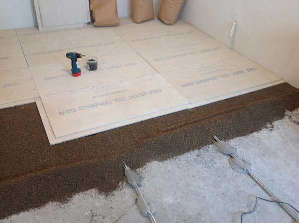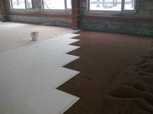 Перед засыпкой покрываемой поверхности обязательно укладывается слой гидроизоляции, необходимой для предотвращения попадания влаги. Крепить его нет необходимости, так как он будет надёжно прижат наполнителем. Дополнительно используют слой специальной защитной ленты по всему периметру обустраиваемого помещения. Величину воспринимаемой полом нагрузки определяют гипсоволоконные листы, подбираемые по толщине.