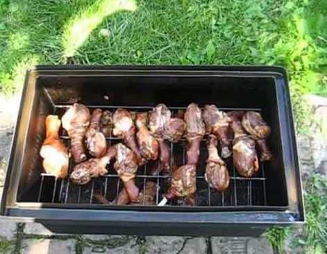 С определённой периодичностью (2-3 часа) мясо переворачивается и покрывается маринадом. Пореже открывайте крышку, так аппарат только охлаждается. Примерно за час до окончания готовки проверьте кондиции продукта. Постоянно следите за топливом.