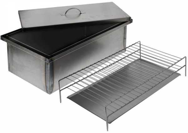 Это металлический короб. Он образован методом сварки. Его крышка – тоже из металла. Она плотно его закрывает. Внутри него монтируются нержавеющие стальные решётки. Такой мини-коптильней можно дополнять мангалы. Только мясо помещается не на шампура, а в эту коптильню.