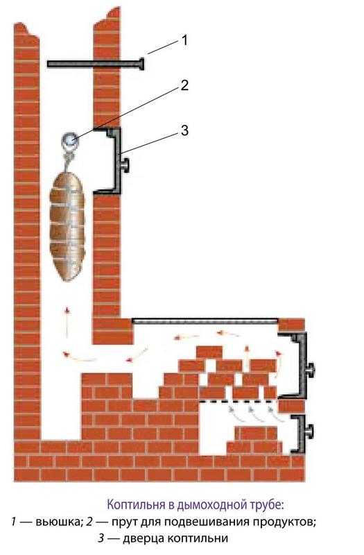 Принцип копчения является таким же, как и в остальных случаях. Сооружение из кирпича напоминает русскую печь, в качестве крышки сооружают дверцу из деревянного материала, её обкладывают глиной, и закрывают металлическим листом, чтобы предотвратить осыпание.