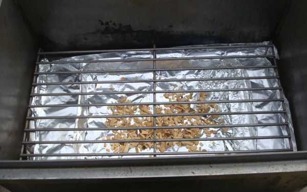 Итак, как только щепа будет заложена на дно агрегата, размещаем поверх нее емкость для сбора жира и сока из готовящихся продуктов. Если и поддон обернуть фольгой, то после копчения необходимость в его тщательной чистке также отпадает.