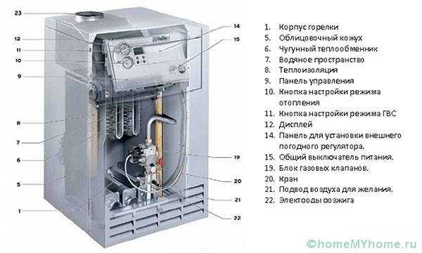 Двухконтурные модели способны одновременно разогревать теплоноситель и подогревать воду для бытовых нужд. В встроено два теплообменника, что существенно усложняет конструкцию.