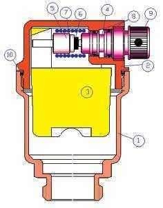 В отличие от стандартных автоматических воздухоотводчиков, VALTEC VT.502 имеет более совершенную конструкцию, благодаря которой уменьшено количество деталей и отсутствуют шарнирные сопряжения деталей. Такое решение обеспечивают высокую надежность и продлевают срок службы устройства. Воздухоотводчик VT.502 (рис. 6) состоит из двух латунных (CW617N) никелированных полукорпусов 1 и 2, соединенных между собою на резьбе суплотнительным кольцом из EPDM 10.Внутри корпуса свободно перемещается полипропиленовый поплавок 3, который своей скобой воздействует на держатель золотника 5, выполненный из нейлона. Золотник 6 с держателем 5 при помощи пружинной связи 7 (материал – нержавеющая сталь марки AISI306) связан с жиклером 4 (нейлон).При накоплении воздуха или газа в верхней части полукорпуса 2 поплавок 3 опускается, воздействуя на держатель 5. При этом золотник 6 открывает калиброванное (1,5 мм) отверстие жиклера 4. Благодаря избыточному давлению транспортируемой среды воздух или другие газы, скопившиеся в верхней части воздухоотводчика, удаляются наружу по каналу жиклера 4. Пробка 9 при поставке находится в закрытомположении, чтобы пыль и грязь не могли проникнуть в корпус. Уплотнительное кольцо на присоединительном патрубке позволяет монтировать воздухоотводчик без дополнительных герметизирующих материалов.
