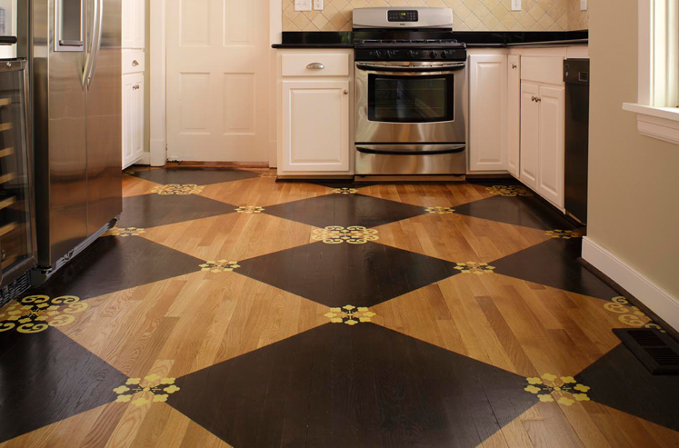 Ее экономная идея сочетает доступный деревянный ламинированный пол с плиткой из искусственного камня, чтобы создать элегантный рисунок инкрустации.