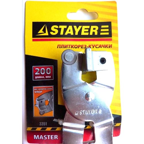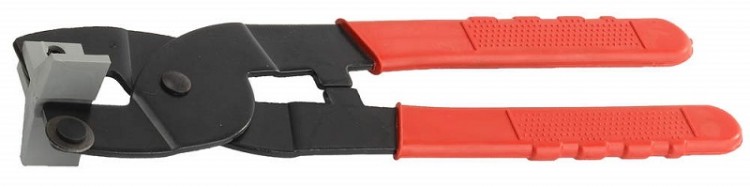 Плиткорез-кусачки обладает принципиально другой конструкцией по сравнению с рассмотренными выше. Это простой и надёжный инструмент для прямой и фигурной резки кафельной плитки и стекла. Выполняется из стали и пластмассы, края – из твердосплавного материала. Может выполнять прямую и фигурную шаблонную резку, не предназначен для толстой напольной плитки.