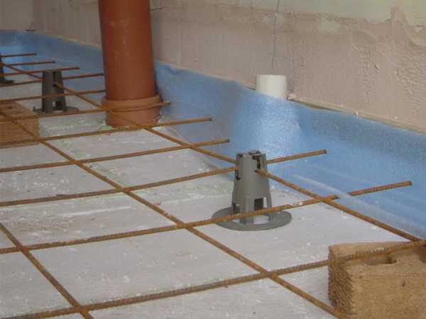 - Укладка сетки. После подготовки чернового покрытия наступает черед армирующего материала. Прежде всего, необходимо уложить пароизоляционную пленку. Затем на ней нужно разложить подготовленную сетку. Обратите внимание, что ее нельзя укладывать прямо на черновое покрытие. Чтобы сетка располагалась на высоте 2-3 см, под нее подкладываются либо готовые подставки, либо куски гипсокартона или утеплителя. От стены надо отступать пару сантиметров, а нахлест сеток между собой должен составлять одну ячейку.