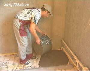 - Залитие бетона. Когда маяки выставлены, можно приступать к замешиванию цементного раствора. Он не должен быть очень густым. Далее раствор нужно аккуратно вылить на сетку.