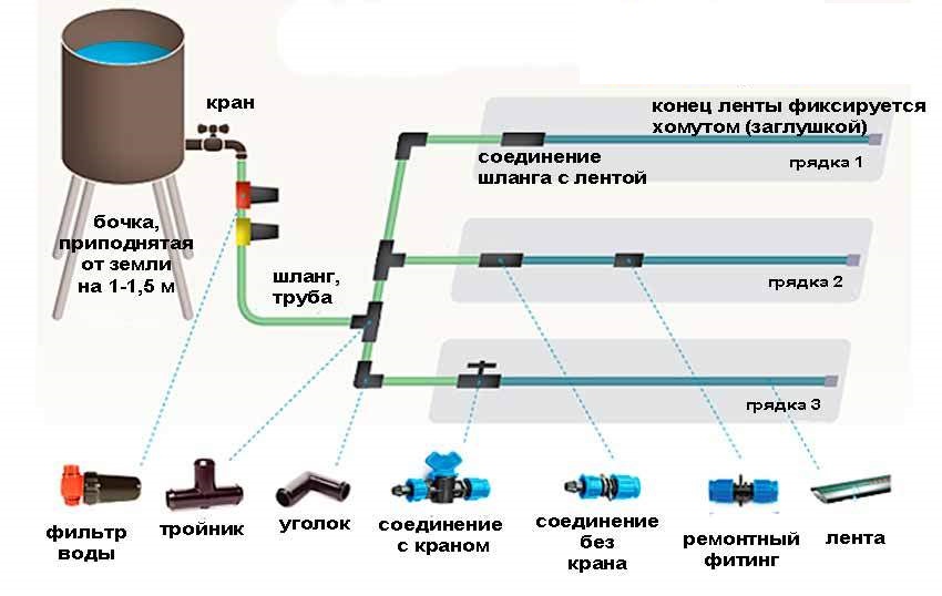 Система капельного орошения представляет из себя своеобразную систему водопровода, которая состоит, как правило, из емкости для воды, труб или шлангов, специальных капельных лент, капельниц, фильтров, включает в себя соединительную арматуру.