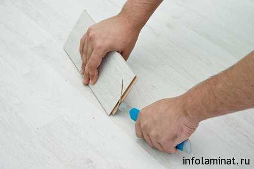 У новой плиты необходимо срезать острым строительным ножом выдающуюся за пределы основного замка часть шипа, нанести клеевой состав или клей-герметик, вложить между остальными планками и зафиксировать. Выступившие излишки адгезионного компаунда снять мягкой тканью. Через сутки готовый ламинированный пол можно нагружать.