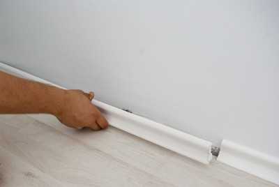 Ремонтная деятельность начинается с демонтажа плинтусов и других элементов, фиксирующих покрытие. Проще всего работать с пластиковыми профильными изделиями, так как для их удаления достаточно снять декоративную маскирующую планку и открутить саморезы.