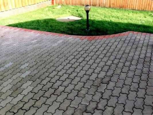 Принцип последующей укладки тот же, что и в обычных случаях: работа проводится по сделанной разметке, плитка укладывается ровно и вплотную друг к другу. По периметру уложенной плитки обязательно устанавливаются бордюры, которые не позволят покрытию смещаться при давлении колес автомобиля на поверхность.
