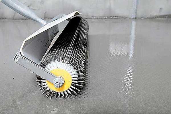При заливке смесь, конечно же, растечется по всей площади, но вероятности в том, что ею будет заполнено все пространство — нет. Поэтому нужно будет раствору немного помочь шипованным валиком. Это можно сделать в краскоступах, не нарушая целостности свежеуложенного покрытия.