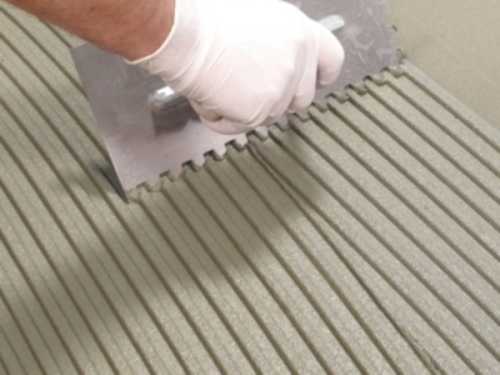 Основание пола смазывается клеем с помощью зубчатого шпателя таким образом, чтобы покрыть два ряда плитки. Не стоит намазывать большую площадь, так как чаще всего такие клеи быстро схватываются.