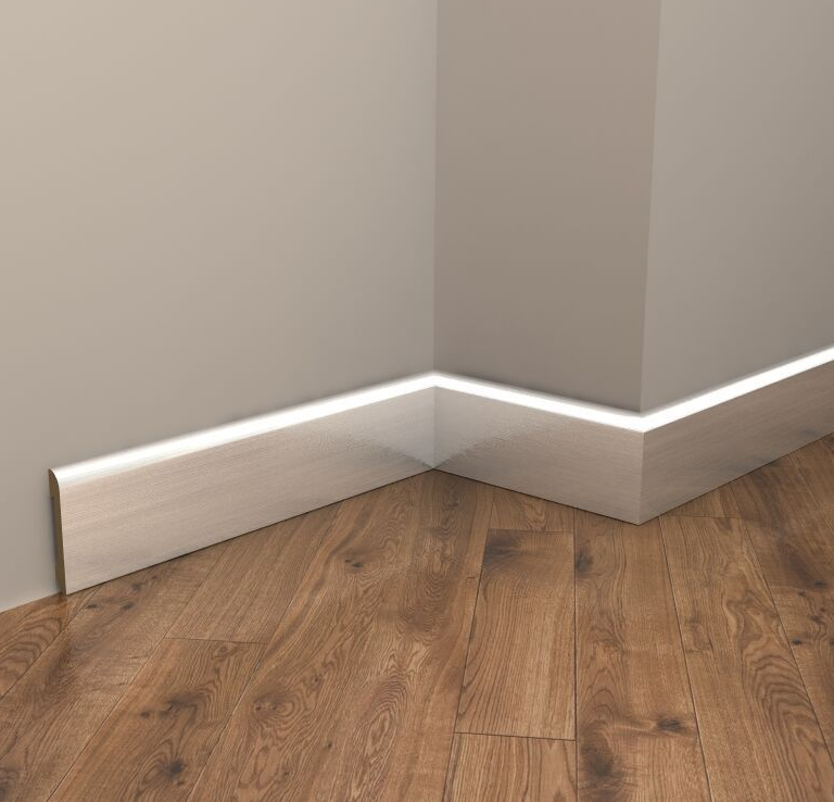 За счет того, что скрытый плинтус не выступает относительно стены, можно легко разместить мебель в помещении и уменьшить скопление пыли. Конструкция алюминиевого основания дает возможность установки светодиодной подсветки.