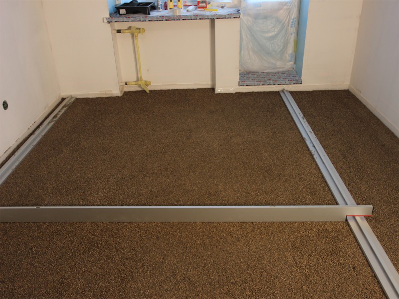 Керамзитовая засыпка насыпается дорожкой под направляющую рейку под контролем лазерной горизонтальной линии утапливается на необходимый уровень.