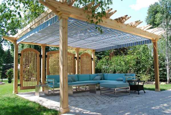 Если возводится беседка-навес для дачи, то есть смысл сделать конструкцию более основательной. (См. также статью Тент для дачи: особенности.)