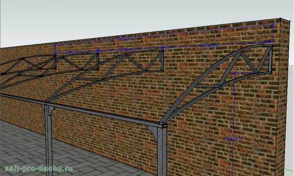 Обратите внимание. Исходя из размеров, мы планируем использовать три листа сотового поликарбоната, и каждый из них будет опираться только на две фермы, не больше! Проверено опытом: там, где вы установите лишние арки, кровлю изувечит первым же градом.