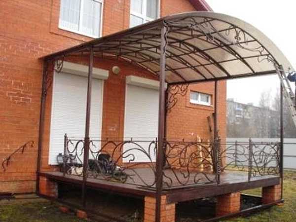 - Профнастил на металлическом каркасе. Такой навес отличается повышенной прочностью. Профлист имеет большой вес, поэтому нуждается в каркасе из тяжелого металла.