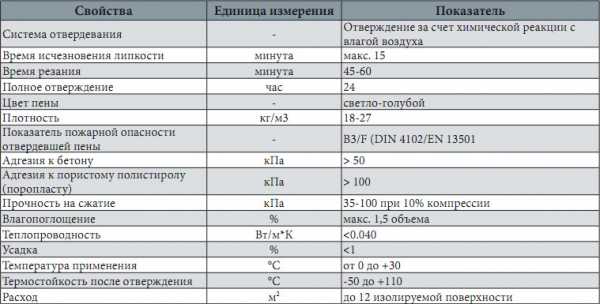 Его характеристики нельзя назвать выдающимися, но они вполне приемлемы. Оценив их, вы поймете, почему именно полиуретановые составы рекомендуется применять при выполнении профессиональных работ по обустройству теплоизоляции из экструдированного пенополистирола.
