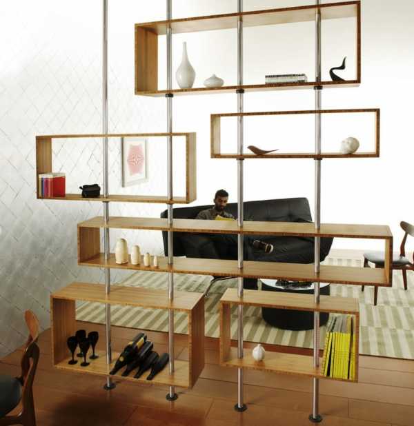 Зонирование комнаты с помощью стеллажей является не менее популярным способом разделения пространства. Обычно такой предмет мебели ставили вдоль стены, но позже дизайнеры сделали его более функциональным, предлагая использовать стеллаж как разделитель пространства. Мебель выполняют в виде полок, закрепленных на несущей конструкции. Стеллаж также используют для хранения различных вещей, которые обычно ставят на полки обычных шкафов.