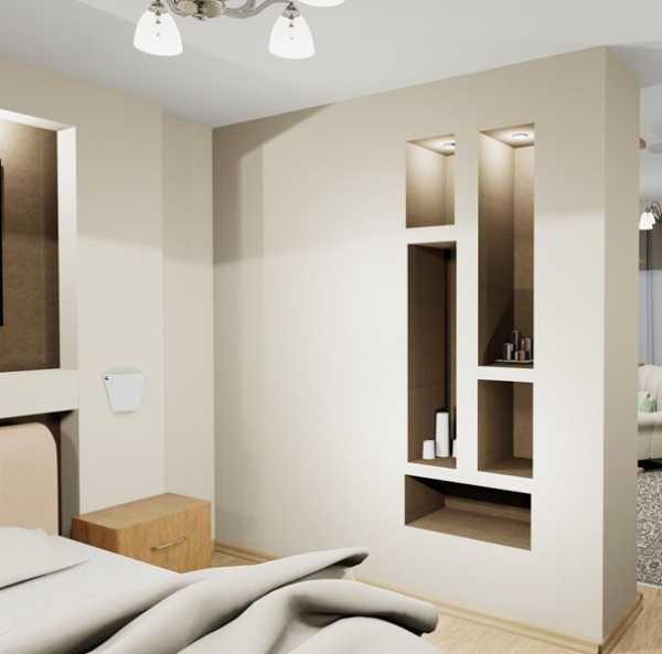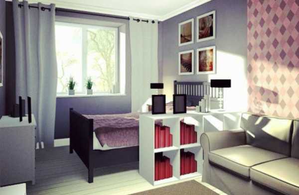 - если же в комнате нет особой ниши для кровати, то установка стеллажа решает эту проблему