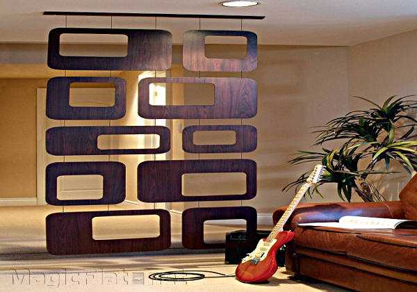 Ажурные перегородки для зонирования комнат выполняют из МДФ или фанеры. Более дорогим вариантом будет дерево. Декоративные перегородки с вырезанным рисунком можно дополнить светодиодной подсветкой. В вечернее время такие подсветки создают романическую атмосферу.
