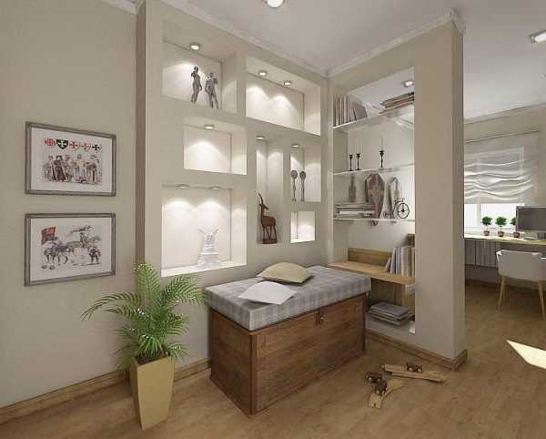 Разделение маленькой комнаты сплошной стеной возможно при наличии двух оконных проемов. В противном случае одна из изолированных частей помещения лишается естественного освещения, оставаясь темной. Чтобы этого не произошло, в качестве перегородки используют конструкции стеллажей.