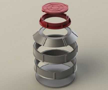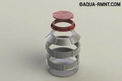 Как и железобетонный вариант, полимерпесчаные колодцы складывают из отдельных колец. Высота каждого — 200 см. На последнее кольцо надевается переходник, похожий на конус, суживающийся кверху, который накрывается люком с крышкой. Кроме того, для полной герметичности емкости выпускается днище высотой в 30 см, которое крепится к кольцу той же системой «паз-гребень».