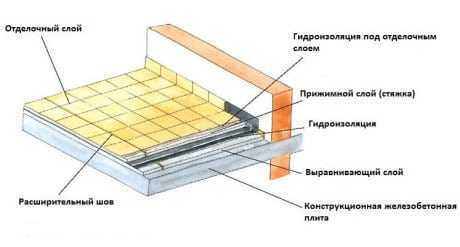 Функция этой дополнительной гидроизоляции заключается в недопущении проникновения влаги как изнутри перекрытия, так и снаружи (со стороны помещения при возникновении протечек).