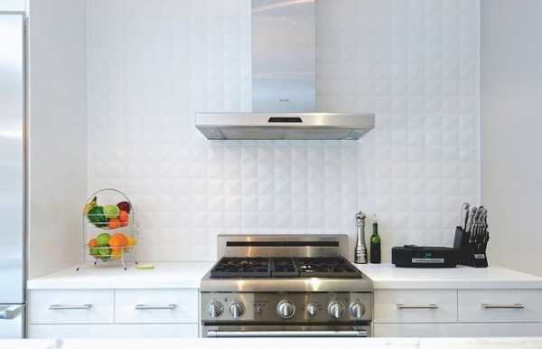 На следующей фотографии мы видим похожий эффект: темная плитка угольного цвета выгодно контрастирует с белоснежными стенами, мебелью и потолком кухни. Коллекция Tile Daily предоставлена компанией Kitchen Gallery.
