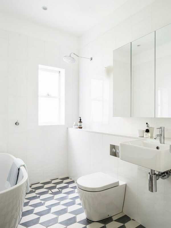 Шахматная плитка, которая отлично сочетается с ванной комнатой в белых и черных тонах.