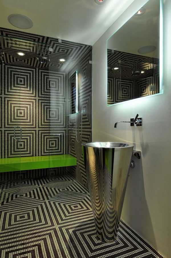 Дизайнеры использовали настолько мелкие детали, что это уже не обычное плиточное покрытие, а целая мозаичная композиция, которая прекрасно сочетается со стенами из крупных мраморных плит.