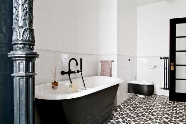 Черно-белая плитка в интерьере индустриальной ванной.