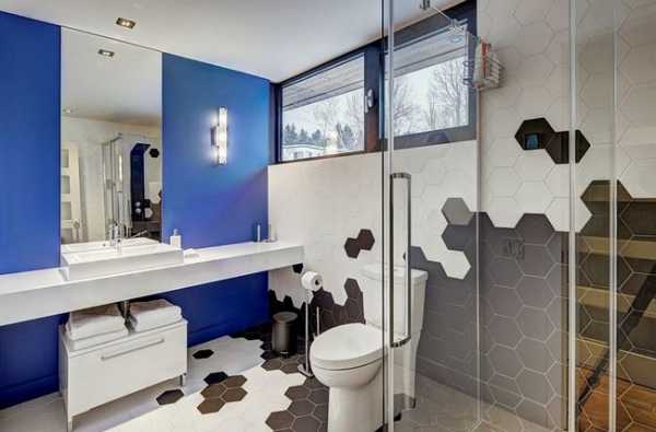 Так, дизайнерская компания Josée Lemire использовала черную и серую шестиугольную настенную плитку для ванной, чтобы декорировать и визуально выделить ряд зон комнаты.