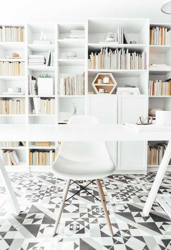 Черно-белая плитка в домашнем скандинавском офисе.