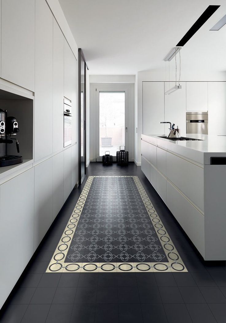 Но эта кухня делает этот классический вид невероятным шагом вперед благодаря очаровательному полу, расписанному вручную. Тщательно выкрашенный пол имеет многомерный геометрический узор, но, поскольку он однотонный, он не подавляет и не отвлекает — просто фантастический. Остальной декор — белые стены и шкафы с черными ручками и столешницами, черно-белая бытовая техника — идеально сочетаются друг с другом, не отвлекая внимание от выставочного пола.