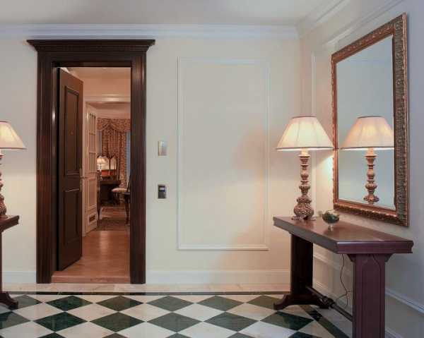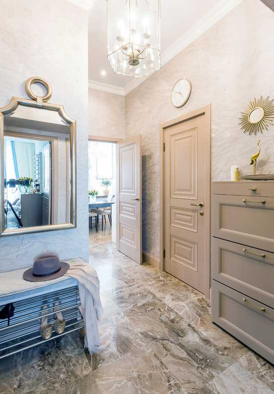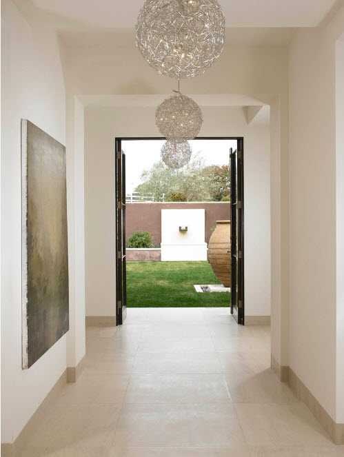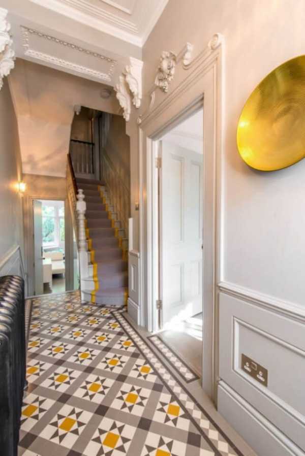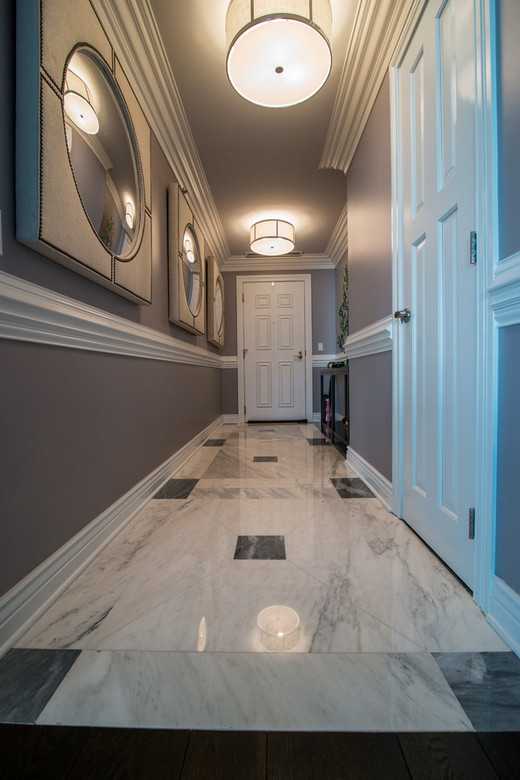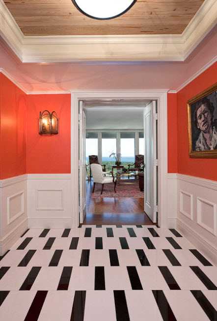 3. Контрастную по отношению к стенам. Чёткое разделение стен и пола позволяет сделать акцент на геометрии и размерах помещения. Если хочется, к примеру, подчеркнуть большой размер и идеальную форму квадратного вестибюля — такая цветовая схема будет весьма кстати.