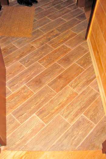 - Плитка, имитирующая деревянные полы, универсальна. Ее можно укладывать так, как укладываются плашки ламината или инженерной доски. Сопоставлять и акцентировать внимание на межшовном пространстве нет нужды. Если есть желание поэкспериментировать, можно уложить плитку на пол в форме «елочки». Получится классический вариант укладки паркета, банально, но оправдано при создании классических интерьеров, стильных, пафосных и брутальных. Хорошо смотрится «елочка», если для укладки выбрана длинная плитка. Такой вариант укладки сегодня применяется при реализации концепций современных стилей.
