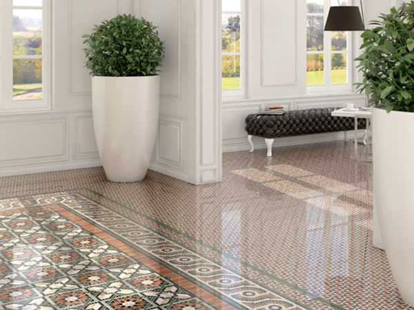 Узорную плитку можно уложить на всю поверхность пола или фрагментарно (в виде панно, коврика). Второй вариант — менее рискованный. С узорным кафелем полы могут быть слишком активными, пёстрыми. От них может буквально рябить в глазах. Если же такая плитка введена в интерьер дозированно, её влияние остаётся довольно мягким.
