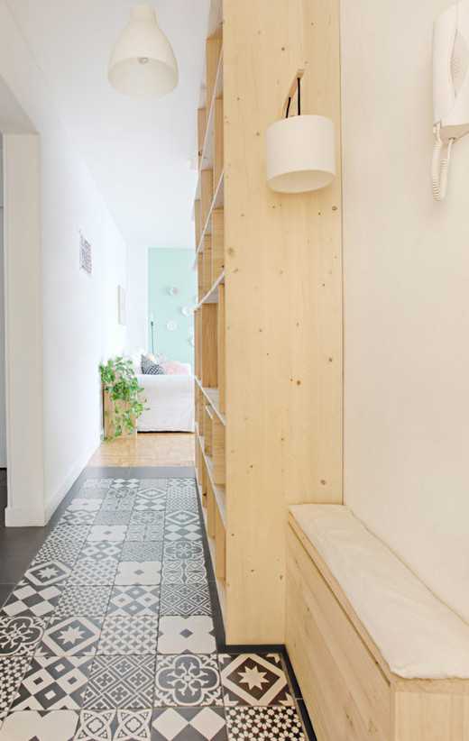 - Создать атмосферу уюта и сделать коридор немного теплее можно с помощью плитки под дерево.