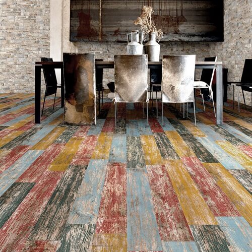 Помимо окрашенного дерева, в керамограните все чаще воплощается колорированное или тонированное дерево. На плитке достоверно воспроизводится естественная фактура древесины, но в необычном цвете: голубом, бордовом, желтом. Смотрится это оригинально и современно, без оттенка старины, как в случае с керамогранитом «под окрашенное дерево».