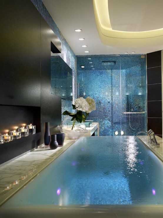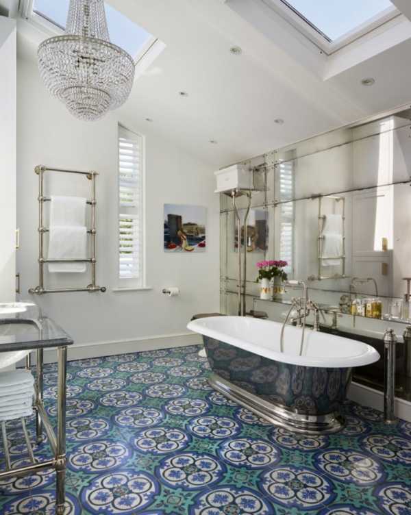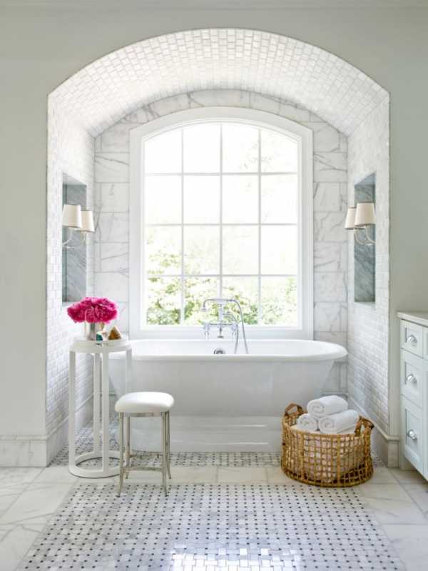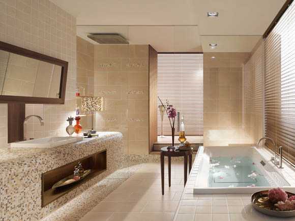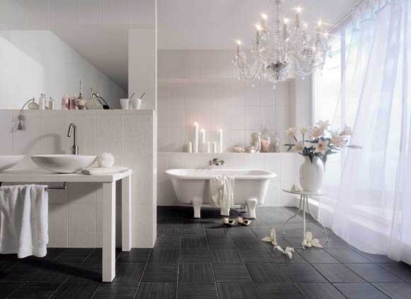 В отделке ванной прекрасно будет смотреться кафель, имитирующий мрамор с его изящным не бросающимся в глаза витиеватым узором. В интерьере комнаты уместны будут также позолота, медь и серебро. Но их необходимо грамотно «вплести» в общее оформление.
