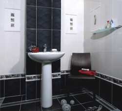 - Черно-белая гамма прямоугольной глянцевой плитки может быть использована для создания интерьера ванной комнаты в стиле минимализма, авангарда, хай-тек.
