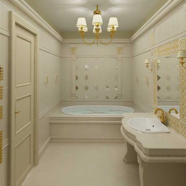 Нестареющая красота и утонченная роскошь. Дизайн ванной в классическом стиле предполагает просторное помещение, оформленное в спокойных светлых тонах. Облицовку стен лучше выполнить кафелем с глянцевым покрытием, выдержанном в белом, бежевом, светло-голубом, оливковом, нежно-желтом оттенках.
