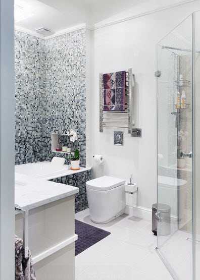 - Очень эстетично в ванной комнате будет смотреться мозаика. Это самый простой способ немного оживить интерьер, внести в него некую изюминку.